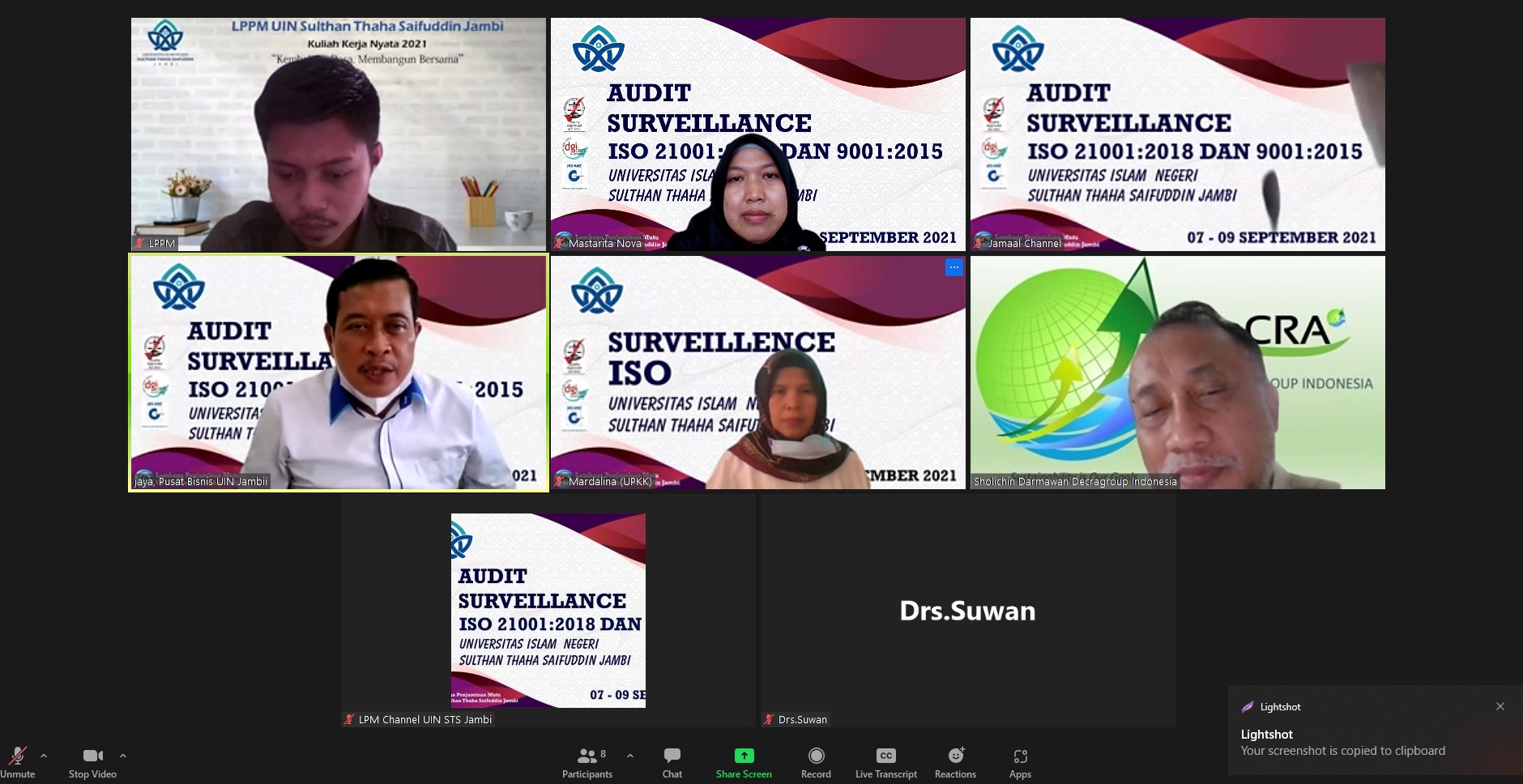 Setelah dilaksanakan Audit Mutu Internal oleh LPM beberapa waktu yang lalu maka selanjutnya Audit dilanjutkan dengan audit surveillance ISO 21001:2018 dan 9001:2015 dari Auditor ISO 21001:2018 dan 9001:2015 yang ditetapkan oleh PT Decra Group Indonesia. Audit tersebut dilaksanakan pada Selasa s.d. Kamis (07-09/09) via zoom meetting. Pada Audit hari pertama auditinya salah satunya adalah Pusat Pengembangan Bisnis. Sedangkan, auditornya adalah Sholichin Darmawan dari PT Decra Group Indonesia. Audit hari pertama tersebut berjalan dengan lancar tanpa kendala dan Pusat Pengembangan Bisnis dapat menjelaskan dengan baik serta menunjukkan bukti dan dokumen yang diminta oleh auditor. Ke depannya Pusat Pengembangan Bisnis akan terus melakukan perbaikan-perbaikan sesuai dengan masukan yang diberikan oleh auditor.